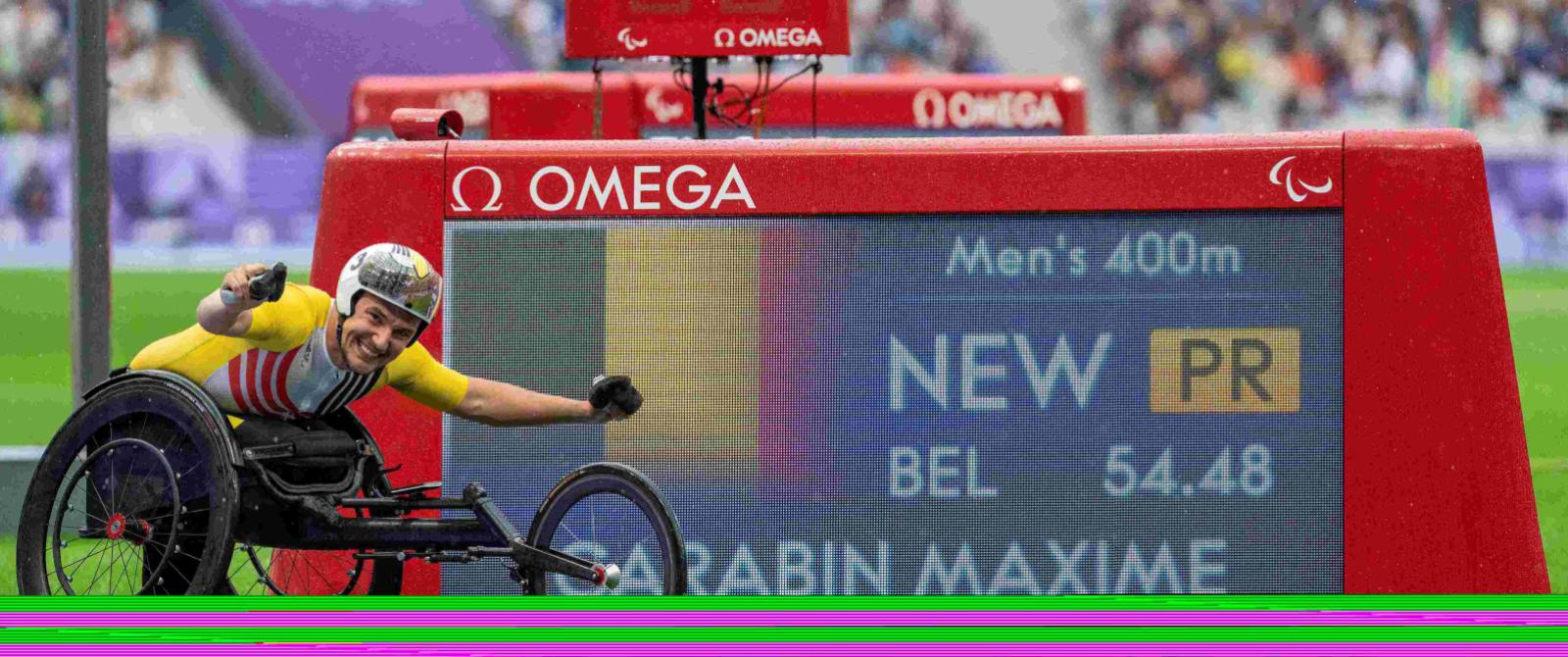 Rolstoelsprinter Maxime Carabin heeft zich vrijdag in het Stade de France op indrukwekkende wijze gekwalificeerd voor de finale van de 400 meter op de Paralympische Spelen in Parijs. De 23-jarige Luikenaar won de eerste reeks in zijn T52-klasse, in de gietende regen, in 54.48, een nieuw paralympisch record.