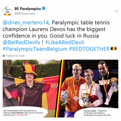 Verschillende atleten van het Paralympic Team Belgium wilden de Rode Duivels succes wensen op het WK in Rusland. De Paralympiërs weten immers als geen ander dat de steun van supporters, familie en vrienden het verschil kan maken op het moment van de waarheid. Om zich als 1 team achter de Rode Duivels te scharen, bundelden ze de krachten voor een gemeenschappelijke aanpak.